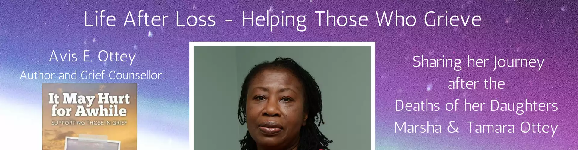 There can be no way to prepare for a parents worst nightmare which is to experience the death of your child. On a summer evening almost 22 years ago, August 15, 1995, Avis Ottey was confronted with the indescribable. Returning to her Scarborough home from work, Avis walked into her family sanctuary to find the bloodied bodies of her teenaged daughters, Marsha and Tami. What thought, feeling, action or life is possible after this? Such a journey is not easily understood, unless you have been there in some way yourself. With this said, Rev. Avis is living proof that this journey is possible. She now graciously and powerfully shares aspects of her healing path through grief counselling, coaching and support, and her book: It May Hurt for a While. Through her powerful, compassionate and skilful work, Rev. Avis Ottey now helps those seeking to reconnect with life while journeying through grief.