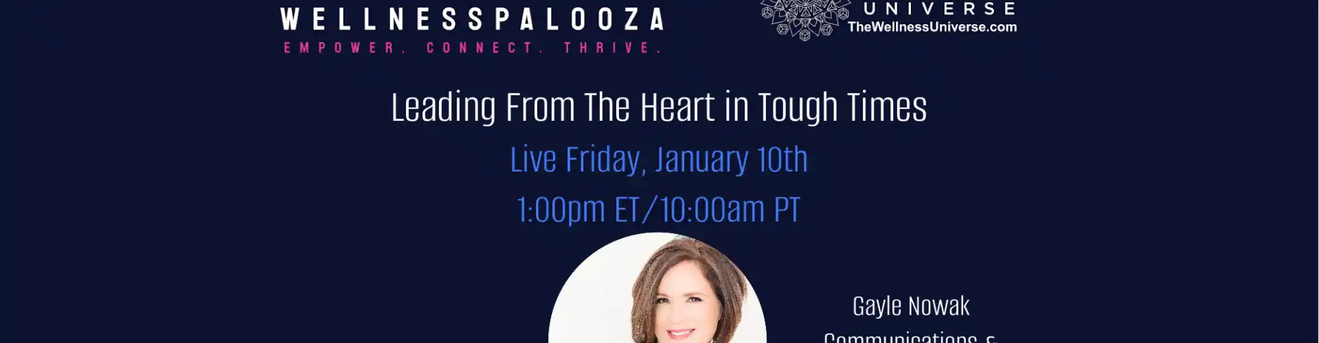 Üdvözöljük a Wellness Universe Wellnesspalooza 2025 21. ülésén. Gayle Nowak kommunikációs és érzelmi wellness edző azt vizsgálja, hogyan lehet rugalmasan, hitelesen és együttérzéssel vezetni a szívközpontú vezetés kulcsfontosságú tulajdonságainak átvételével a kihívásokkal teli időkben.