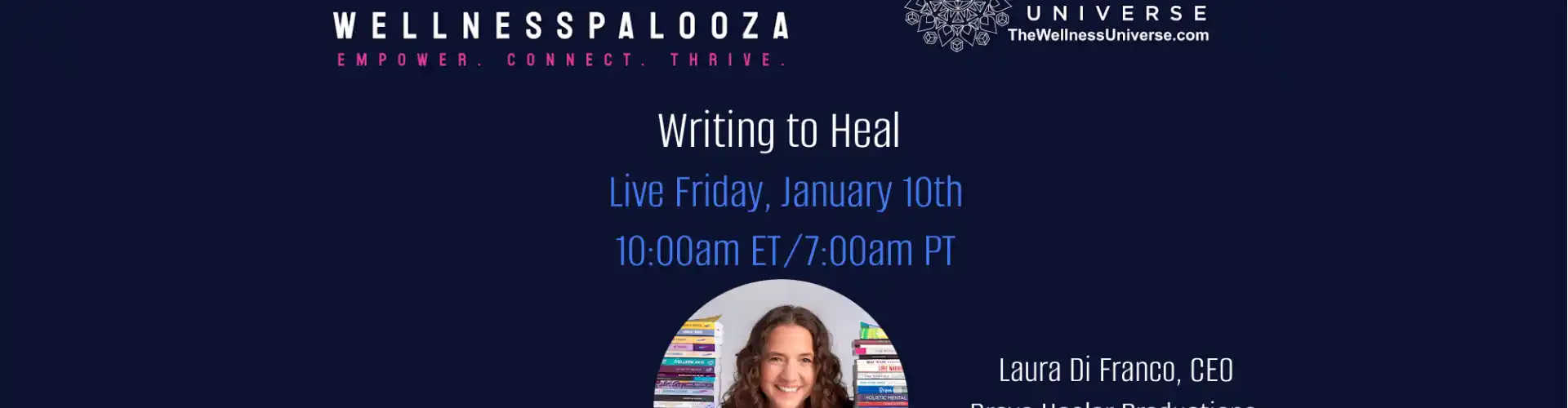 Üdvözöljük a The Wellness Universe Wellnesspalooza 2025 19. ülésén. Laura Di Franco, a Brave Healer Productions vezérigazgatója segít abban, hogy személyes történeteit a gyógyulás, az önfelfedezés és az elhatalmasodás eszközeivé alakítsa, miközben megtanulja, hogyan hagyhat maradandó örökséget a művészeten keresztül. az írásról.