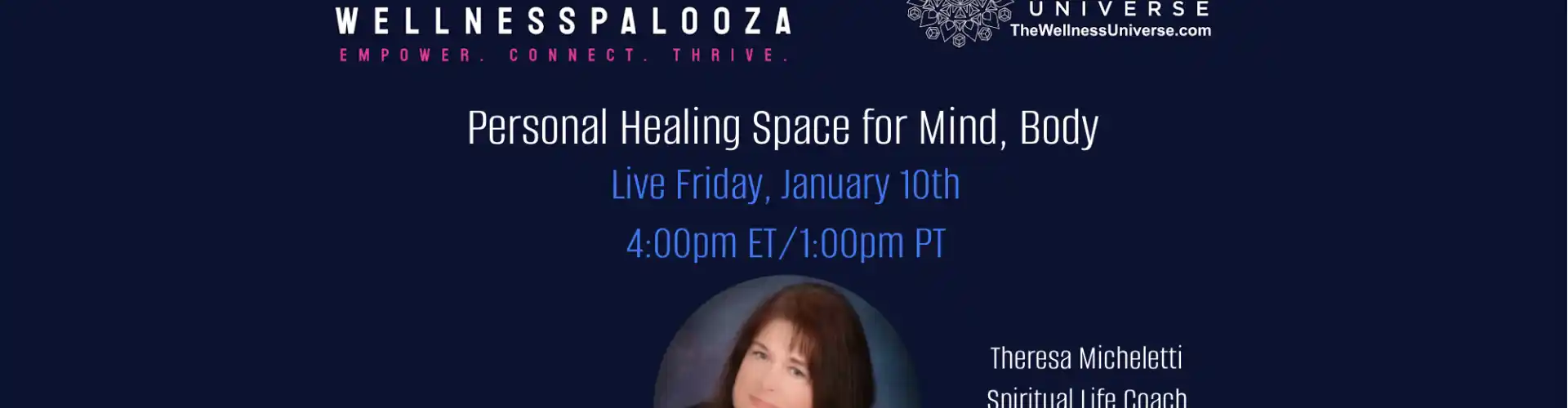 Üdvözöljük a The Wellness Universe Wellnesspalooza 2025 23. ülésén. Theresa Micheletti spirituális életvezetési edző elvezeti Önt saját Mennyei Gyógyító Szobájának létrehozásához – egy személyre szabott teret testének, elméjének és szellemének ápolására, amelyet arra terveztek, hogy támogassa a gyógyulást, amikor csak szüksége van rá. .
